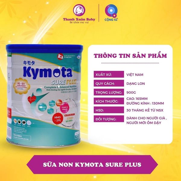 - Sữa non Kymota Sure Plus là sản phẩm bổ sung dinh dưỡng hàm lượng cao. Cung cấp đầy đủ các dưỡng chất hằng ngày cho cơ thể, với các loại vitamin và khoáng chất thiết yếu như: Canxi, Kẽm, Phospho, Protein, các vitamin A, D, C, B2, B6, B12, Acid Folic. Omega 3-6 tốt cho tim mạch.