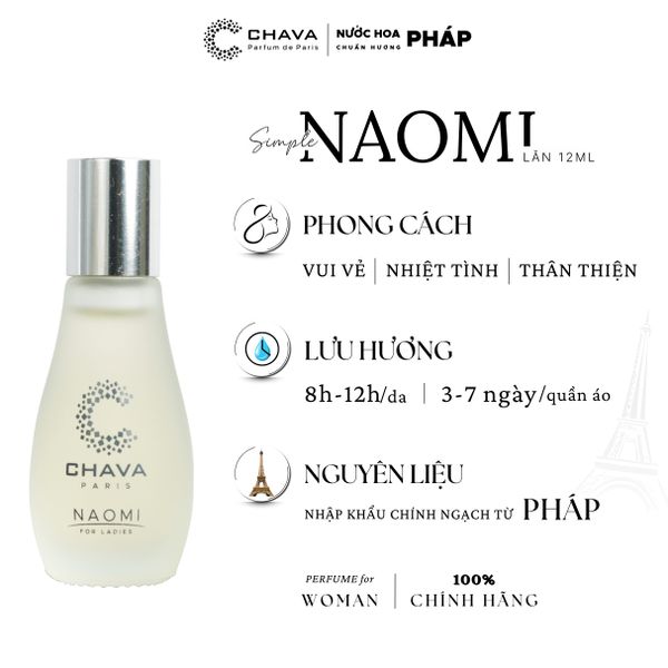- Nước hoa nữ Chava Naomi được sản xuất từ nguồn nguyên liệu thiên nhiên (hoa cỏ, trái cây) được nhập khẩu chính ngạch từ Paris.