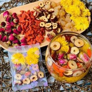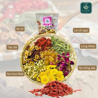 Thành phần: Long nhãn, kỷ tử, hoa cúc vàng, táo đỏ, nụ hồng, nhài, cỏ ngọt