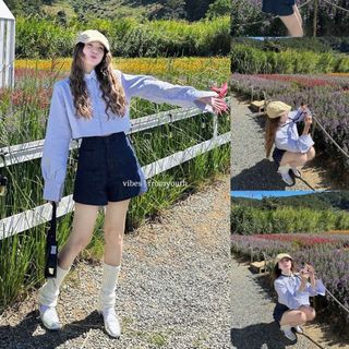 ÁO SƠ MI CROPTOP phối CỔ TRẮNG Chất vải kate sọc mát freesize dưới 55kg
