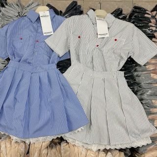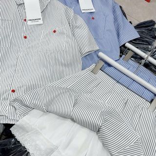 SET áo sơ mi sọc tay lỡ phối nút đỏ kèm chân váy xếp li lót ren Chất kate lụa sọc freesize dưới 55kg.