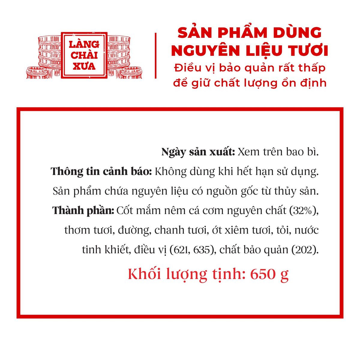 - Nguyên liệu chính để ra được "MẮM NÊM PHA SẴN ĂN LIỀN" trứ danh ngon khó cưỡng: cốt mắm nêm cá cơm, chanh tươi, tỏi, ớt xiêm tươi, nước, muối tinh khiết, đường. Tất cả được pha trộn theo công thức chỉ có tại Bảo tàng nước mắm Làng Chài Xưa - Bảo tàng nước mắm đầu tiên tại Việt Nam.