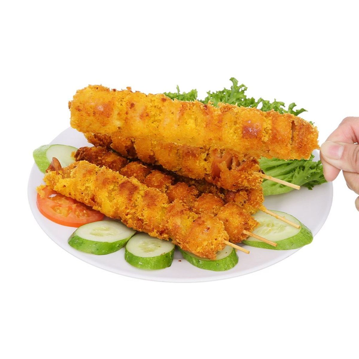 Thành phần: Thịt (heo, gà) 600g/kg, nước, chất ổn định (1412), tinh bột mì, tinh bột khoai tây, bột bắp, đạm đậu nành, bột lòng trắng trứng, bột chiên xù, bột cá, màng bọc collagen, đường, muối, chất điều vị, chất nhũ hóa, màu thực phẩm tự nhiên, chất điều chỉnh độ acid, tiêu, hành, tỏi, chiết xuất ớt, nước mắm, chất chống oxy hóa, chất bảo quản