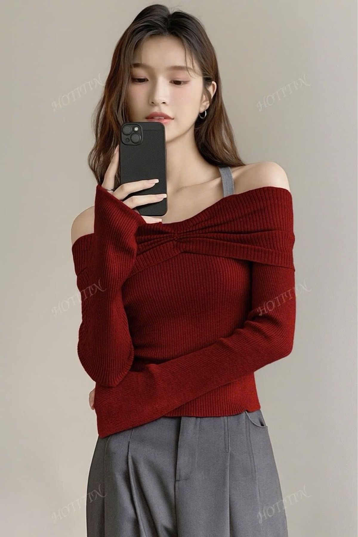 Áo thun bẹt vai tay dàiChất liệu: Len tăm đũaMàu: Đen-đỏ đô- xám-trắngfreeize dưới 53kg