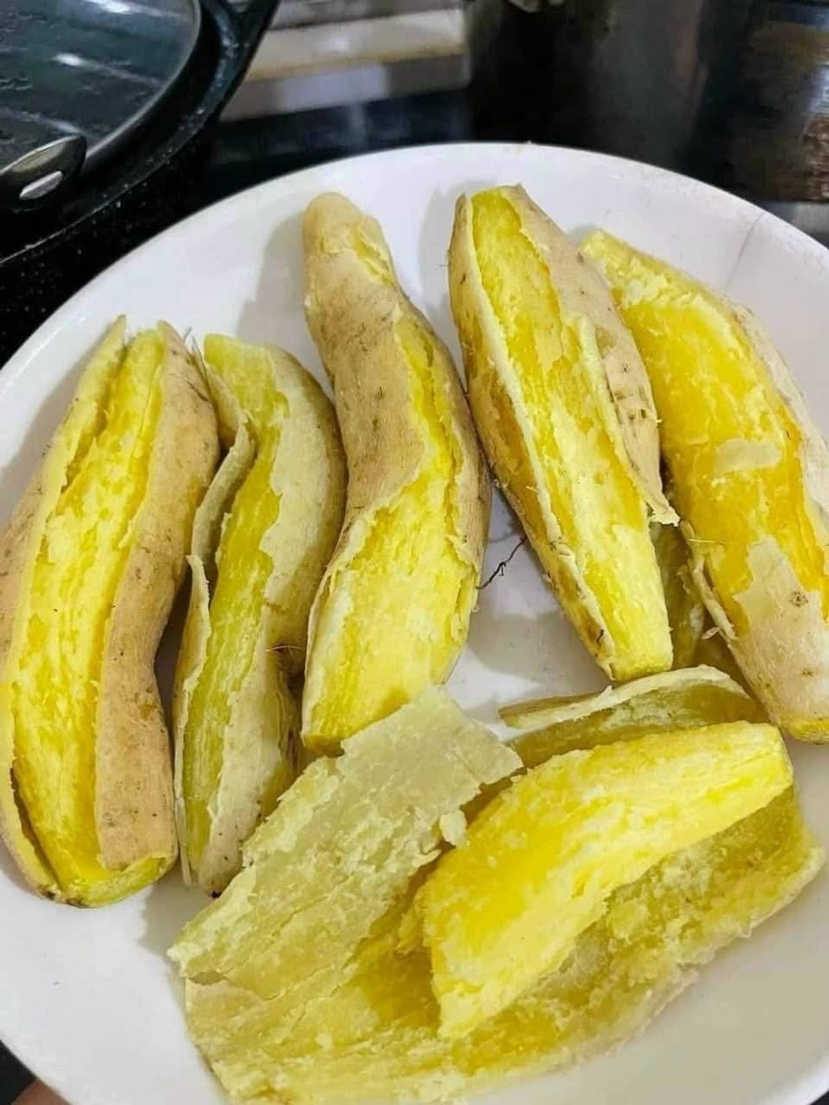 khoai lang trắng sữa, luộc chín ruột vàng, mềm dẻo ngọt, ít bột