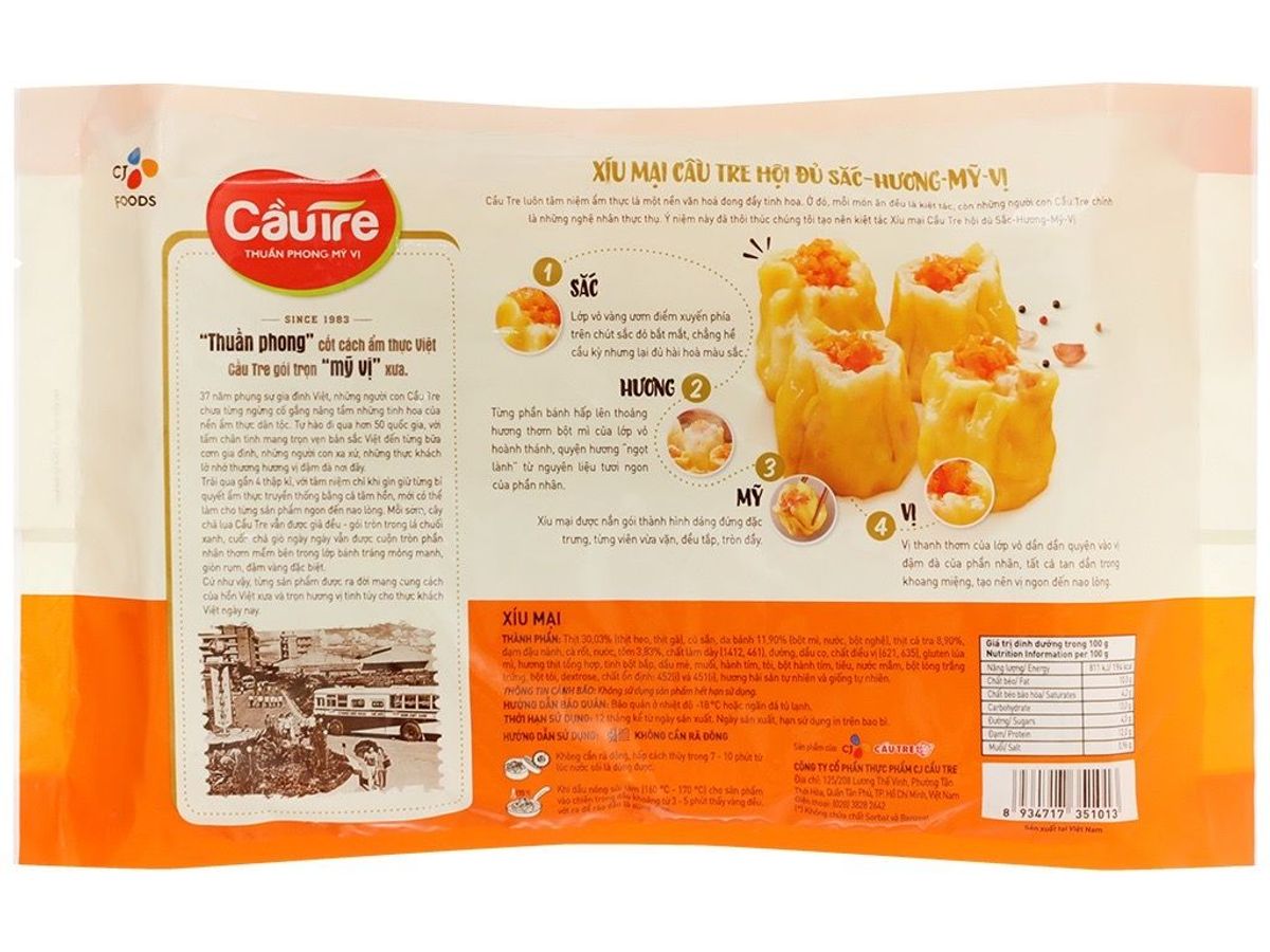Xíu mại Thực Phẩm Cầu Tre do CJ food phân phối được chế biến từ các nguyên liệu chất lượng cao, được lựa chọn kỹ càng, đảm bảo độ tươi ngon và tự nhiên nhất. Vì vậy, sau khi chế biến, sản phẩm vẫn giữ được nguyên hương vị và màu sắc của các nguyên liệu, đảm bảo ngon miệng khi dùng.