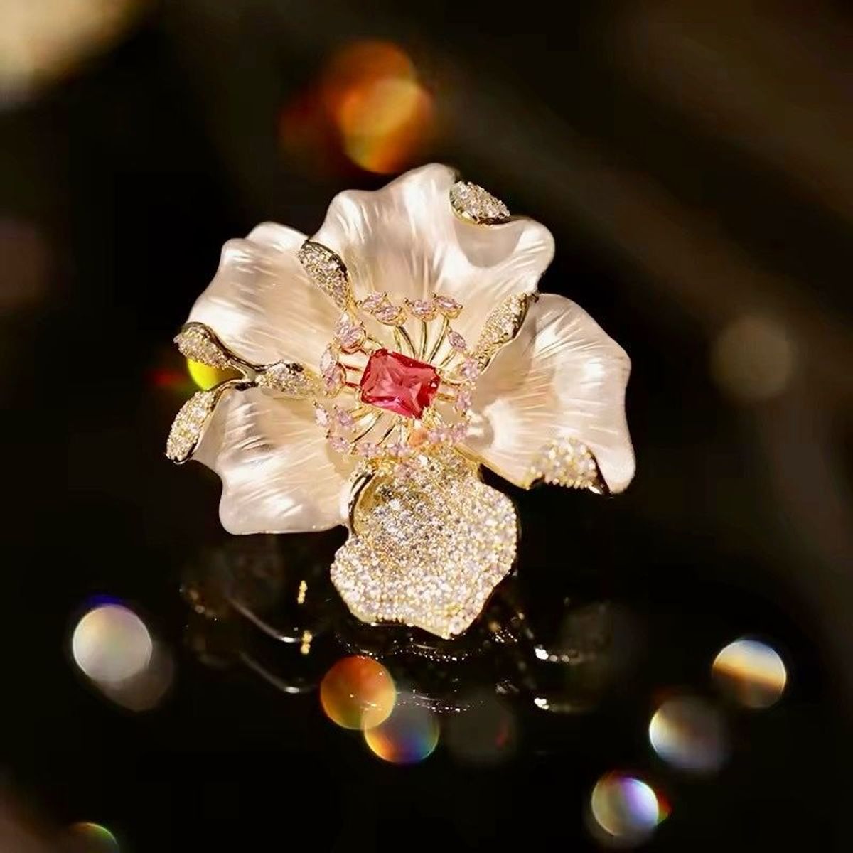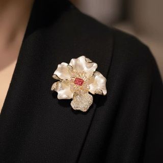 Đây là một chiếc trâm cài hình hoa mẫu đơn màu trắng sang trọng. Phụ kiện này được thiết kế với những cánh hoa có màu trắng đục, với phần nhụy hoa làm điểm nhấn bằng đá pha lê màu đỏ hồng lấp lánh.