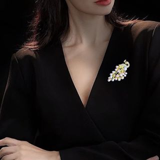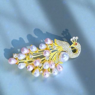 Đây là một chiếc trâm cài áo hình con công thanh lịch, thường được làm từ hợp kim mạ vàng, đính kèm ngọc trai (có thể là ngọc trai nuôi cấy hoặc ngọc trai nước ngọt) và các viên đá pha lê hoặc zircon lấp lánh.